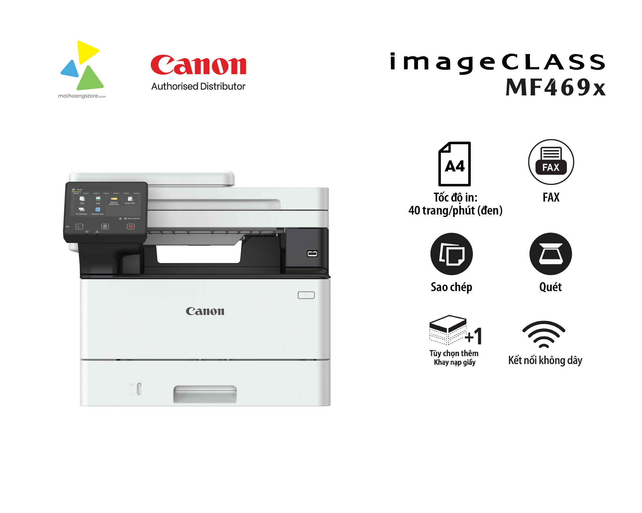 Máy in laser đa năng Canon imageCLASS MF469x là giải pháp toàn diện được thiết kế để tối ưu hóa hiệu suất và quy trình làm việc trong mọi môi trường văn phòng. Với khả năng in, scan, copy và fax tốc độ cao, cùng các tính năng thông minh và bảo mật vượt trội, MF469x không chỉ giúp bạn hoàn thành công việc nhanh chóng mà còn đảm bảo an toàn cho mọi tài liệu quan trọng.