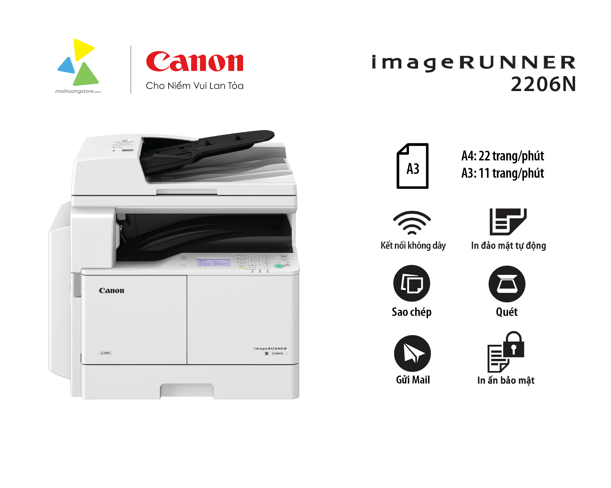 Canon imageRUNNER 2206N là giải pháp văn phòng toàn diện, được thiết kế đặc biệt cho các doanh nghiệp vừa và nhỏ (SMB). Đây là một thiết bị đa chức năng A3 mạnh mẽ, tích hợp khả năng in, sao chụp và quét tài liệu, đáp ứng mọi nhu cầu làm việc hàng ngày với hiệu suất cao và chi phí tối ưu.
