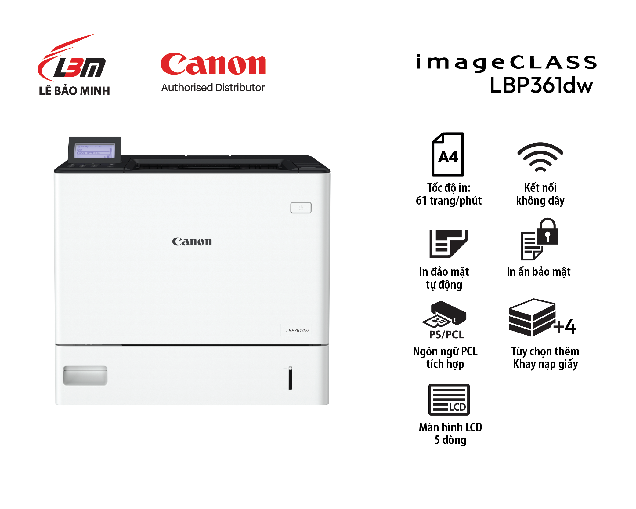 Canon imageCLASS LBP361dw là sự lựa chọn lý tưởng cho các văn phòng và doanh nghiệp đang tìm kiếm một máy in laser trắng đen hiệu suất cao, an toàn và đáng tin cậy.