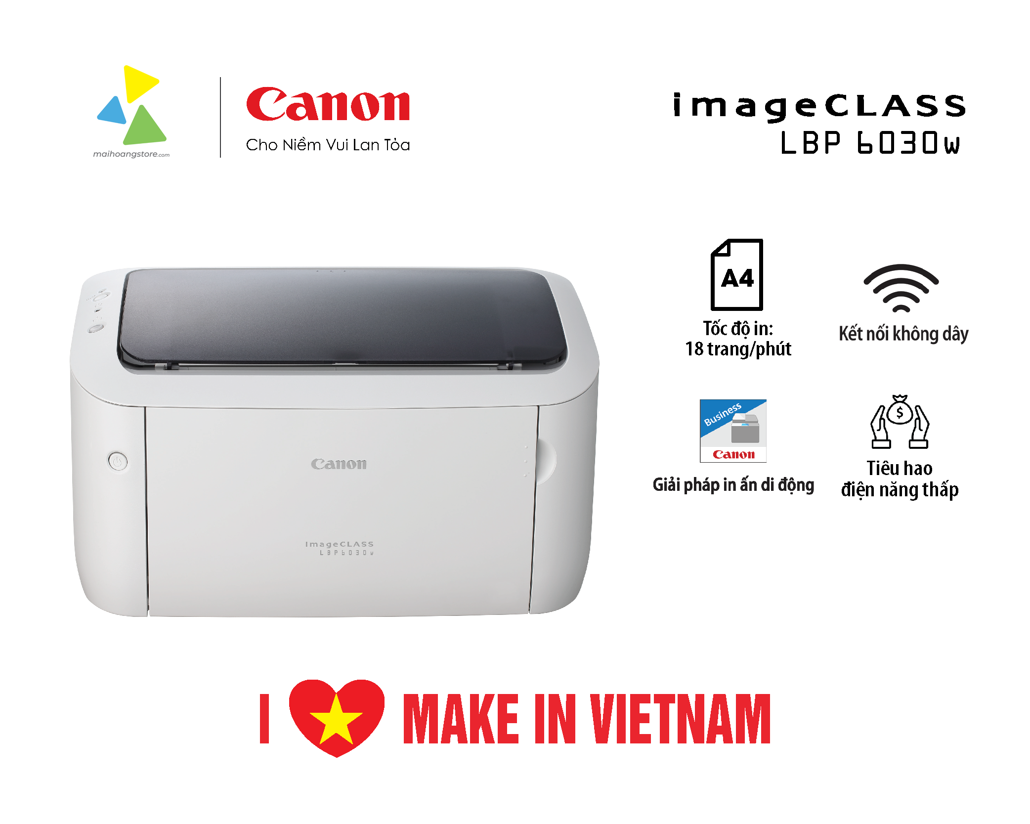 Tự hào sản xuất tại Việt Nam, máy in Laser Canon LBP6030w là lựa chọn hoàn hảo cho văn phòng hiện đại và gia đình với sự kết hợp tinh tế giữa hiệu suất vượt trội, thiết kế nhỏ gọn và công nghệ kết nối không dây Wi-Fi tiên tiến.