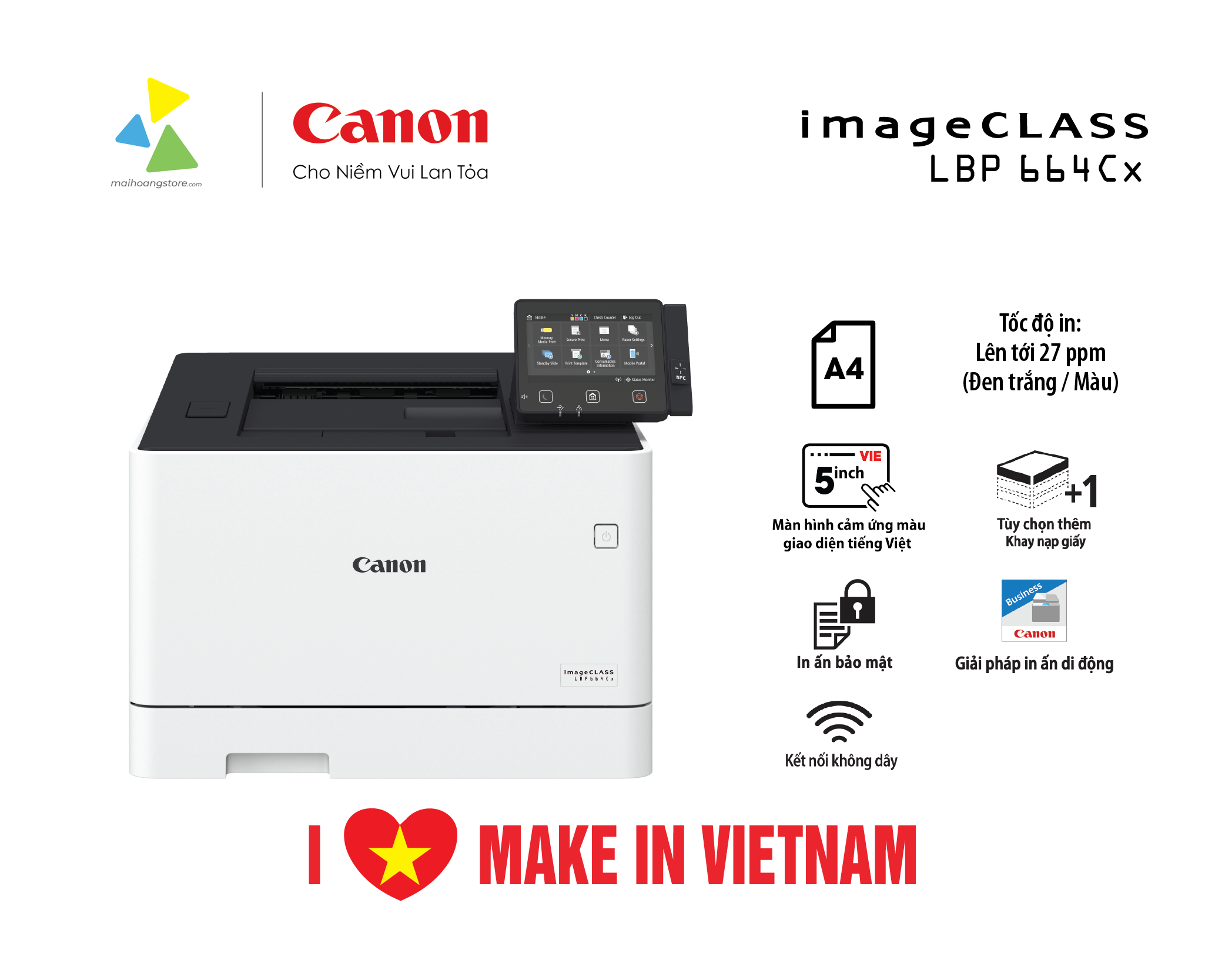 - Chất lượng In màu Tuyệt hảo: Với độ phân giải lên đến 1.200 (tương đương) x 1.200dpi (tương đương) và công nghệ màu V2 độc quyền của Canon, mọi bản in đều sắc nét, chi tiết và có màu sắc trung thực, sống động.