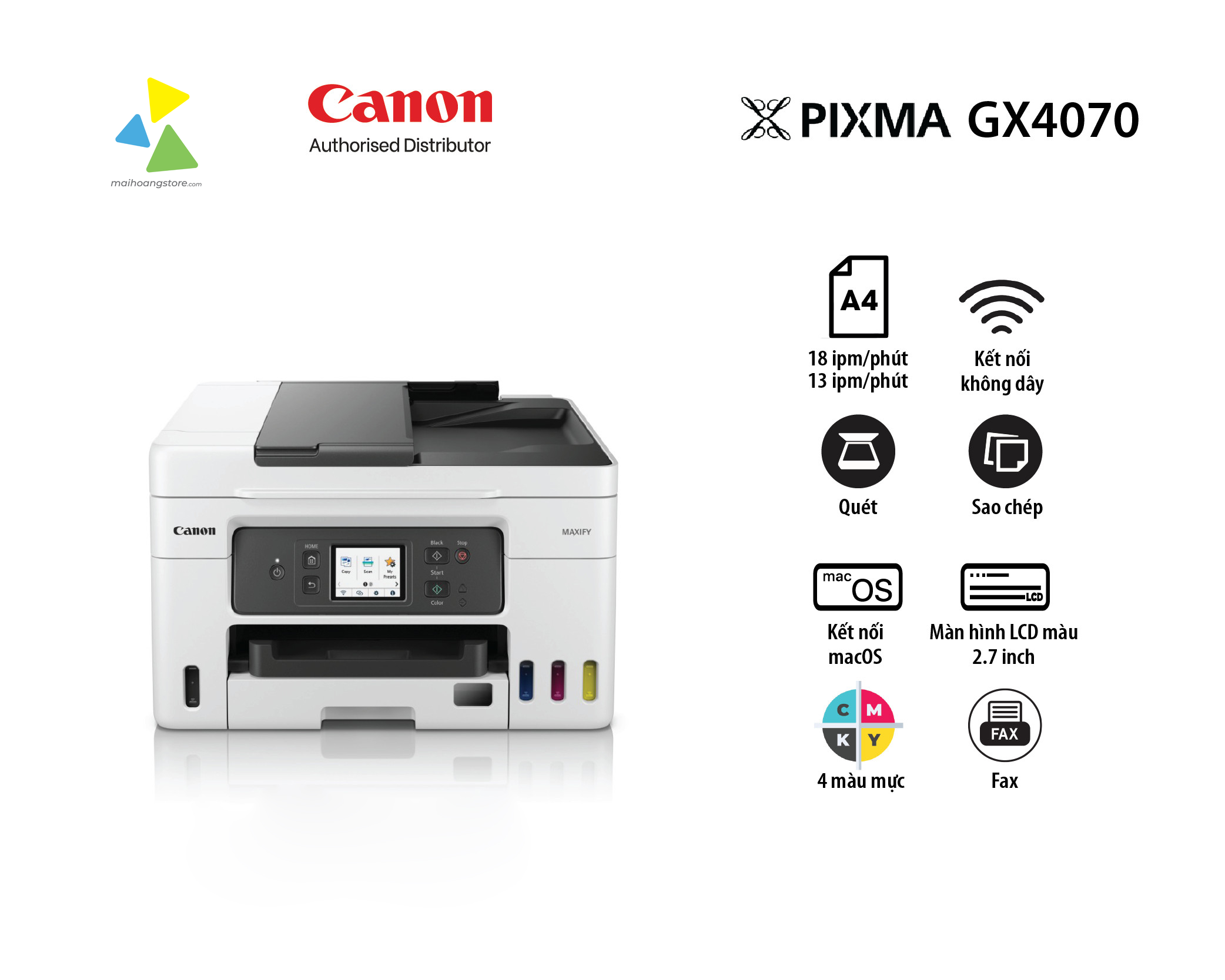 Canon MAXIFY GX4070 là giải pháp in ấn toàn diện, được thiết kế đặc biệt cho các văn phòng tại gia và doanh nghiệp vừa & nhỏ. Với khả năng 4-trong-1 (In, Scan, Copy, Fax) và hệ thống mực liên tục MegaTank, GX4070 không chỉ mang lại hiệu suất làm việc ấn tượng mà còn giúp tối ưu chi phí in ấn đáng kể. Tận hưởng sự tiện lợi từ kết nối không dây và khả năng xử lý đa dạng loại giấy, biến mọi tác vụ văn phòng trở nên dễ dàng hơn bao giờ hết.