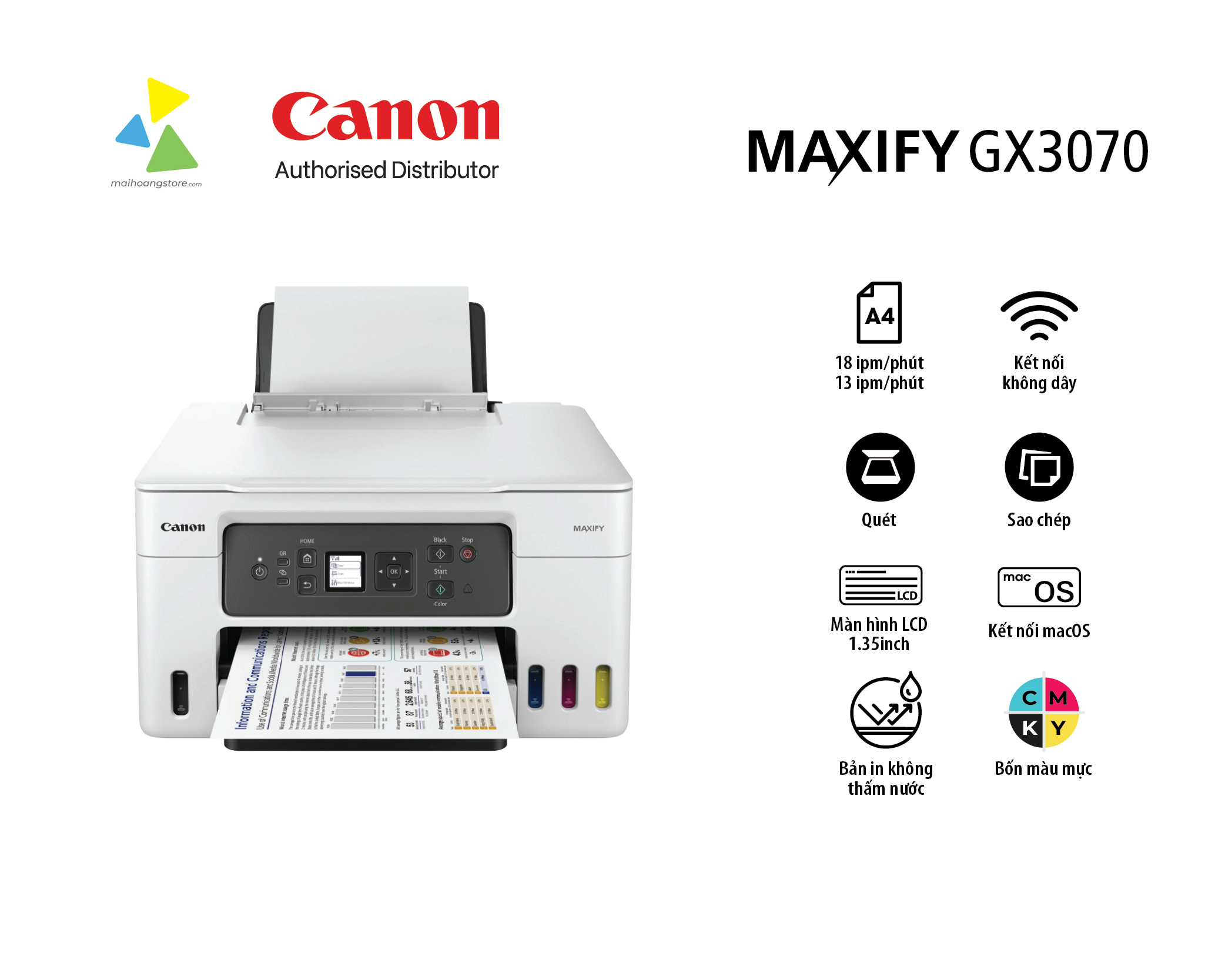 Máy in phun đa năng Canon MAXIFY GX3070 là lựa chọn hoàn hảo cho các văn phòng vừa và nhỏ, đáp ứng mọi nhu cầu in, scan, copy với hiệu suất vượt trội và chi phí vận hành tối ưu. Tích hợp công nghệ bình mực liên tục, khả năng kết nối không dây linh hoạt cùng nhiều tính năng thông minh, MAXIFY GX3070 giúp công việc in ấn trở nên dễ dàng và hiệu quả hơn bao giờ hết.