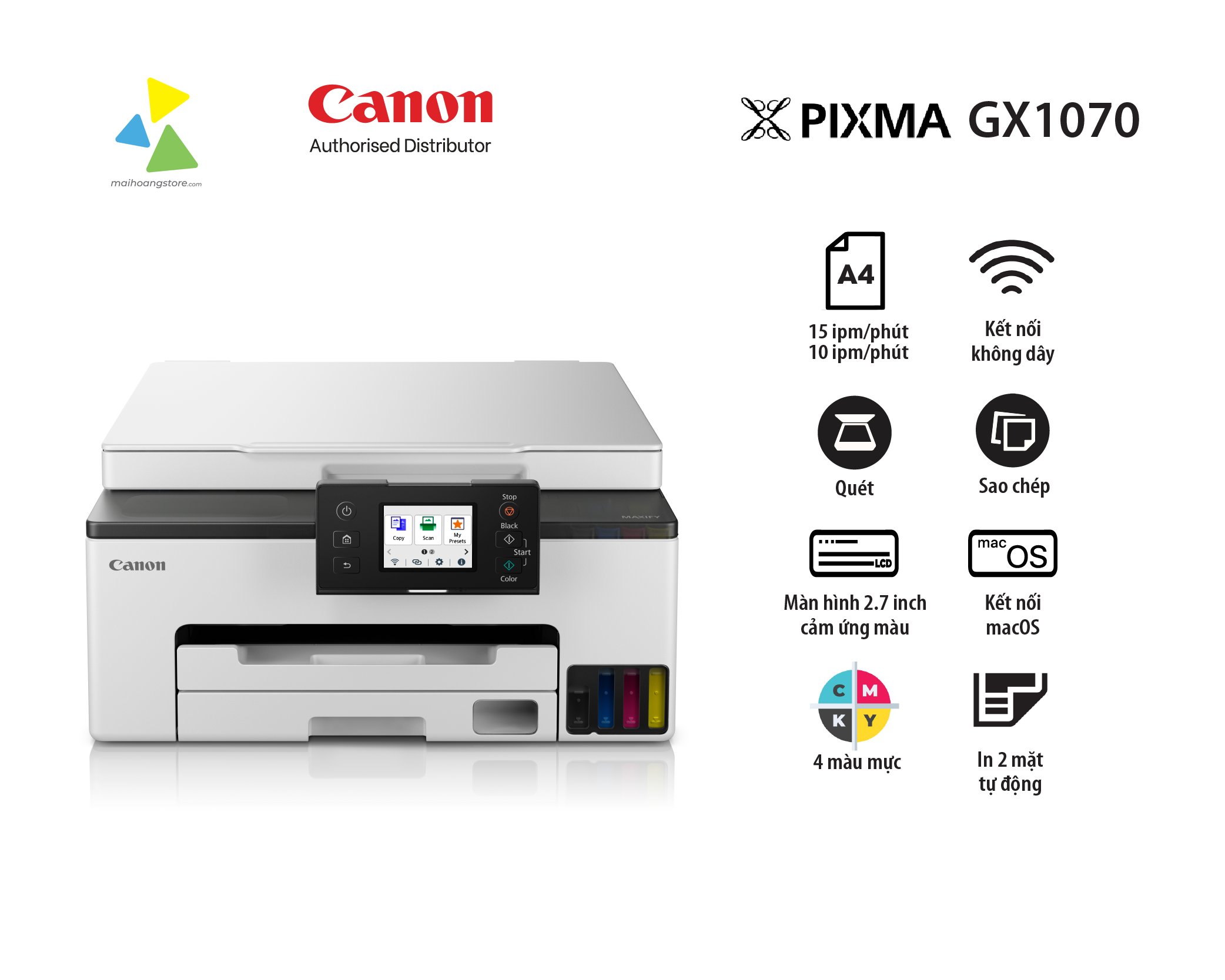 Canon Maxify GX1070 là máy in phun màu đa năng với hệ thống mực liên tục tiên tiến, mang lại hiệu suất in ấn vượt trội và tiết kiệm chi phí tối ưu. Tích hợp tính năng in đảo mặt tự động, quét, sao chụp cùng kết nối Wi-Fi linh hoạt, đây là lựa chọn lý tưởng cho mọi văn phòng hiện đại.