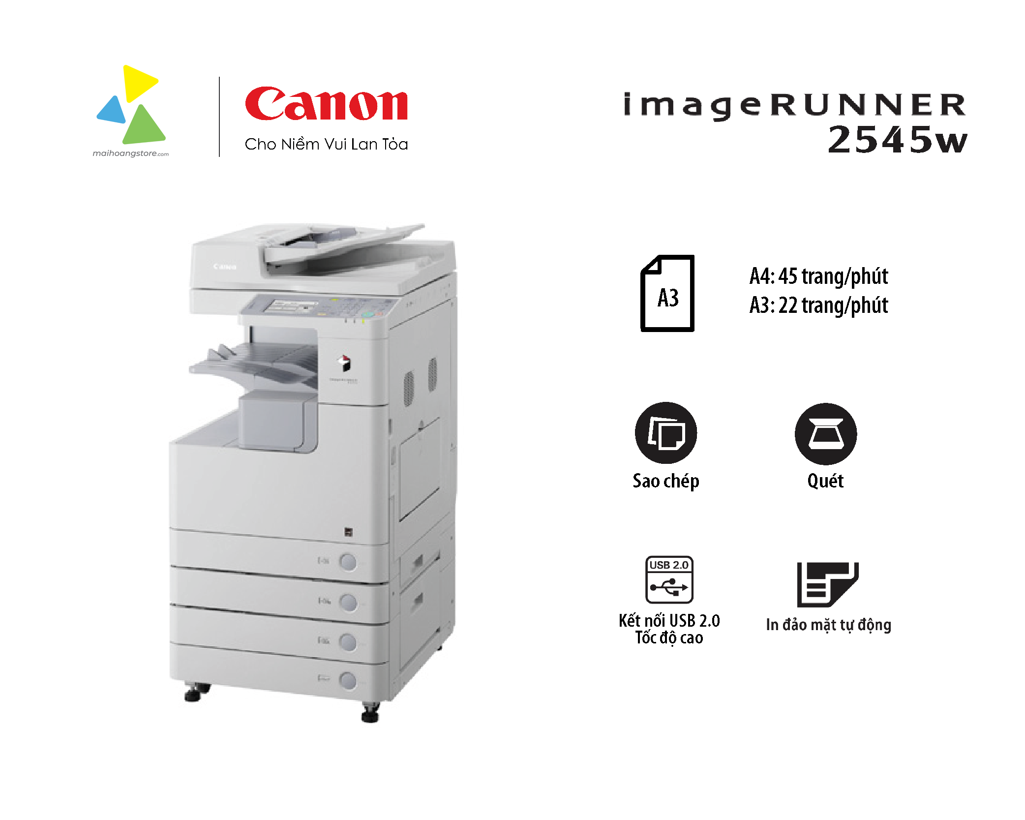 Chọn máy photocopy đa năng Canon imageRUNNER 2545W để nâng tầm hiệu suất và chất lượng công việc, biến mọi thách thức tài liệu thành lợi thế cạnh tranh cho doanh nghiệp của bạn.
