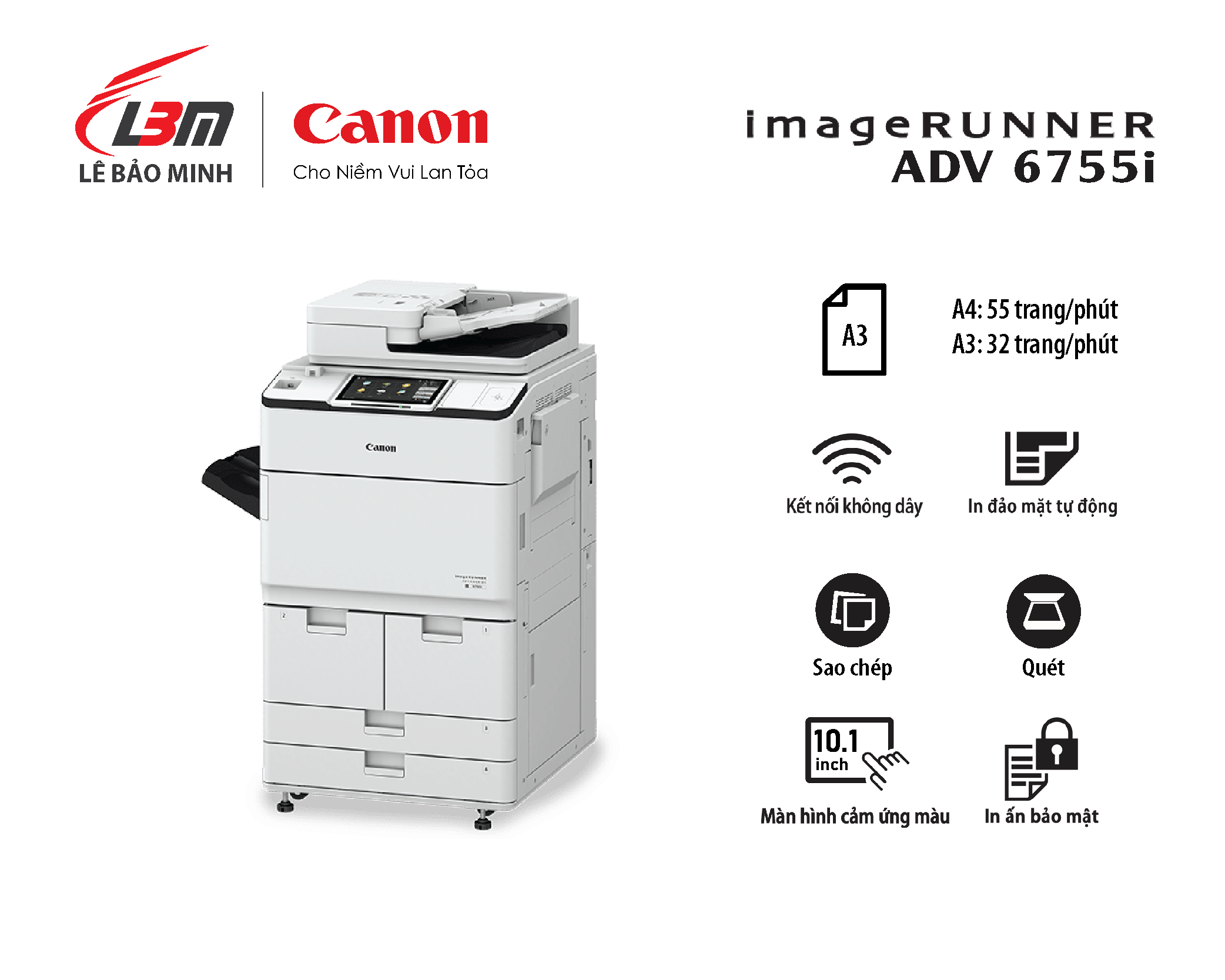 - In ấn di động và đám mây: Tương thích với AirPrint, Mopria, Google Cloud Print, Canon Business PRINT và uniFLOW Online, cho phép in ấn linh hoạt từ mọi thiết bị.