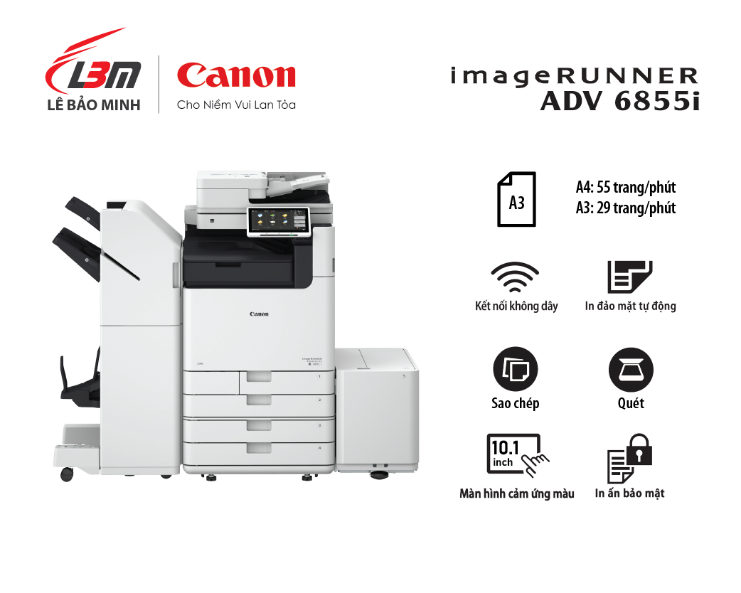 Canon imageRUNNER ADVANCE DX 6855i là lựa chọn lý tưởng cho các doanh nghiệp tìm kiếm một máy photocopy đa chức năng mạnh mẽ, an toàn và dễ quản lý, nâng tầm hiệu suất làm việc văn phòng.